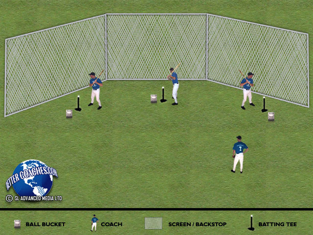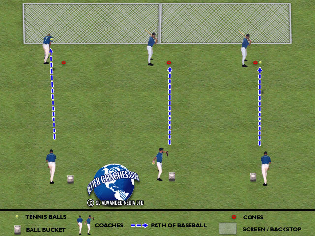 Divide players into two groups. Place one group at second base and the other at home plate. Two coaches throw from the front and back of the pitching mound (coach at the front of the mound throws to hitters at the plate while coach standing at the back of the mound throws to hitters at second base)...